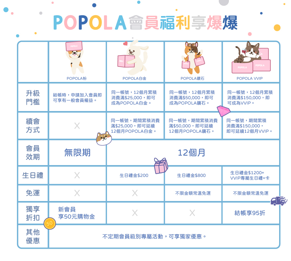 1.會員分成4種:POPOLA粉/POPOLA白金/POPOLA鑽石/POPOLA VVIP