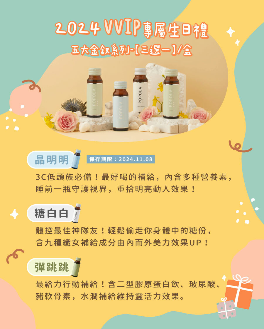 (VVIP專屬生日禮+生日卡依生日前月已達資格予以發放,若於生日當月升級,將於次年度生日發放,系統於每月20號產生下月份生日名單,請會員即早填寫生日資料,以避免系統無法判別!)