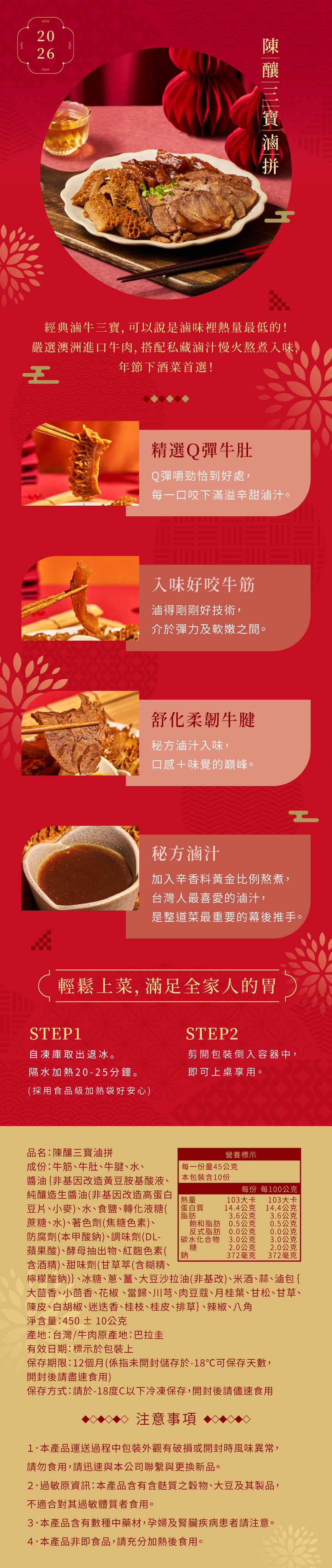 嚴選澳洲進口牛肉,搭配私藏滷汁慢火熬煮,年節下酒菜首選。