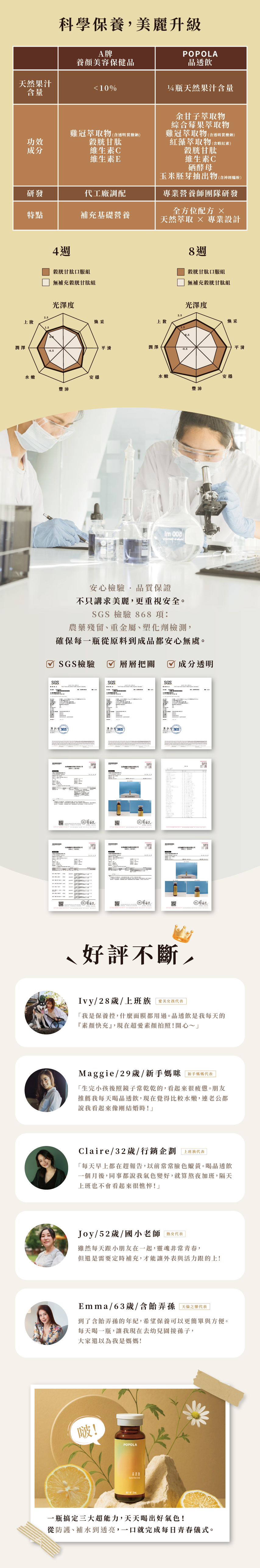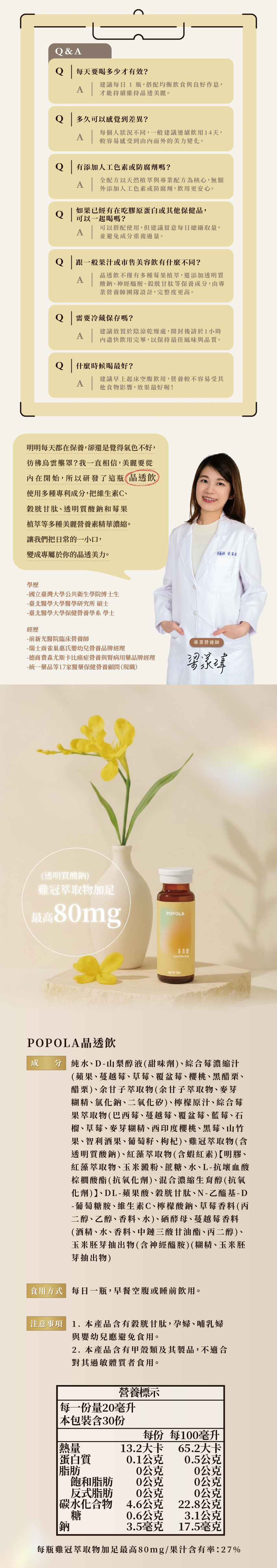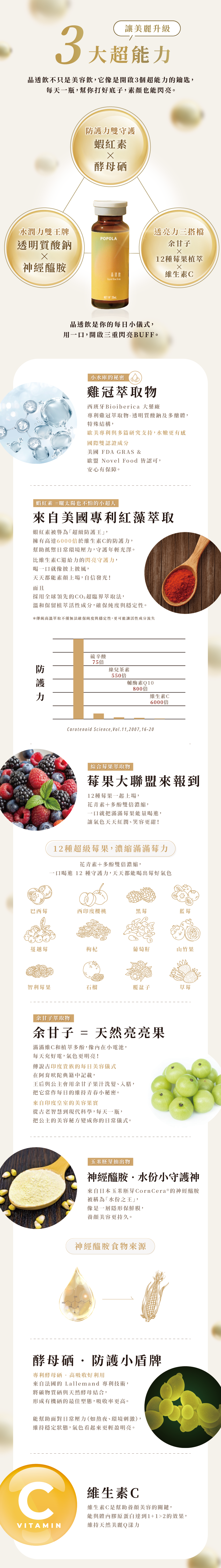 專利成分:雞冠萃取物(透明質酸納,最高80mg)、蝦紅素、酵母硒、余甘子、12種莓果萃取、神經醯胺、維生素C