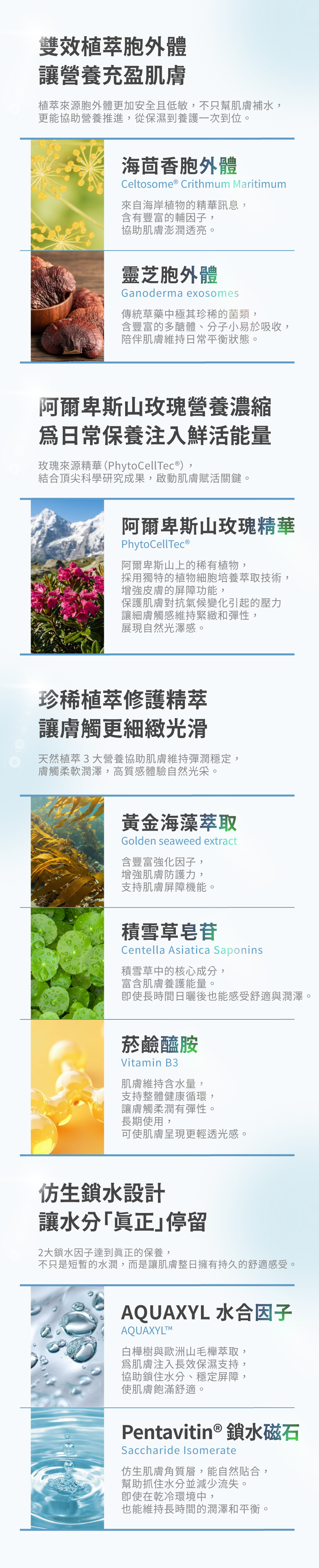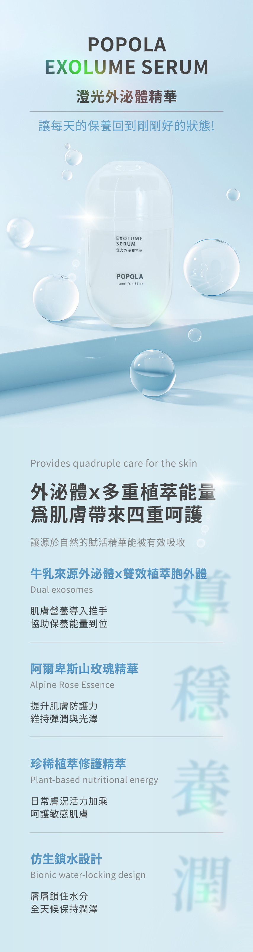 結合雙效植物外泌體與阿爾卑斯山玫瑰精萃,啟動肌膚修護能量,為肌膚注入四重呵護機制。