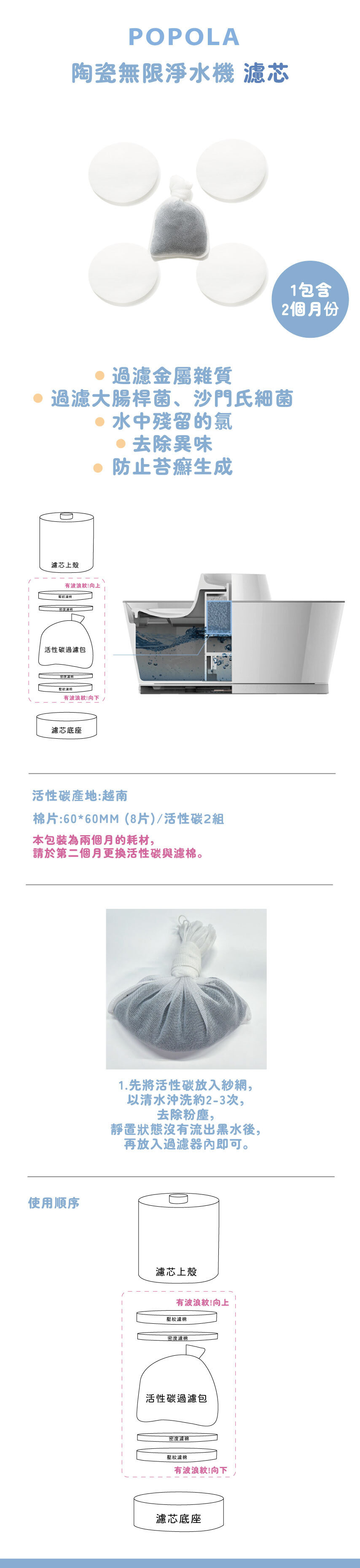 ●去除水中殘留的氯、異味,且防止苔蘚生成
